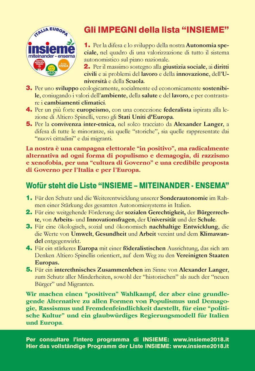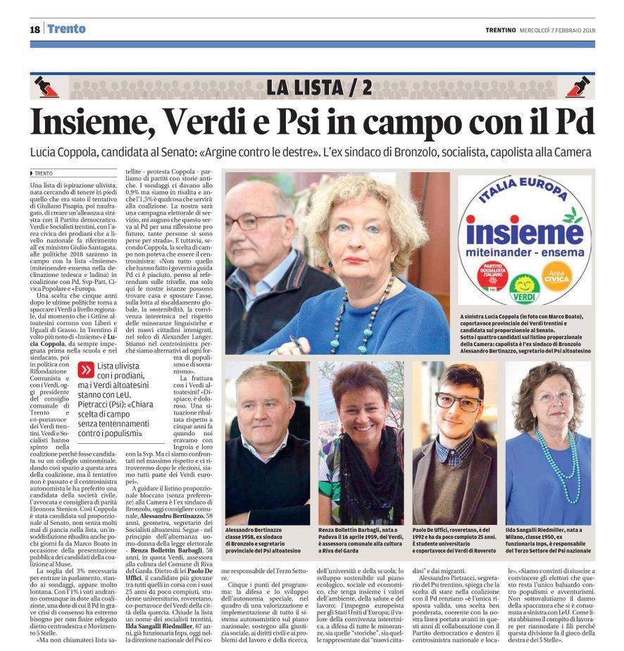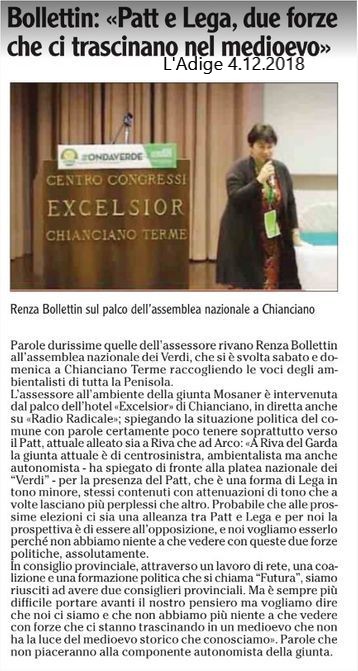 Esperimento ripreso con buon risultato elettorale (8 % complessivo, due consiglieri eletti, di cui uno espressamente "verde") nelle recentissime elezioni provinciali nel Trentino. La lista si chiama "Futura 2018", e assembla, in un mix finora riuscito, un giornalista "nuovo" alla politica e qui forse sta in gran parte il motivo del successo , con pezzi di sinistra (purtroppo non tutti) oltre naturalmente ai Verdi.